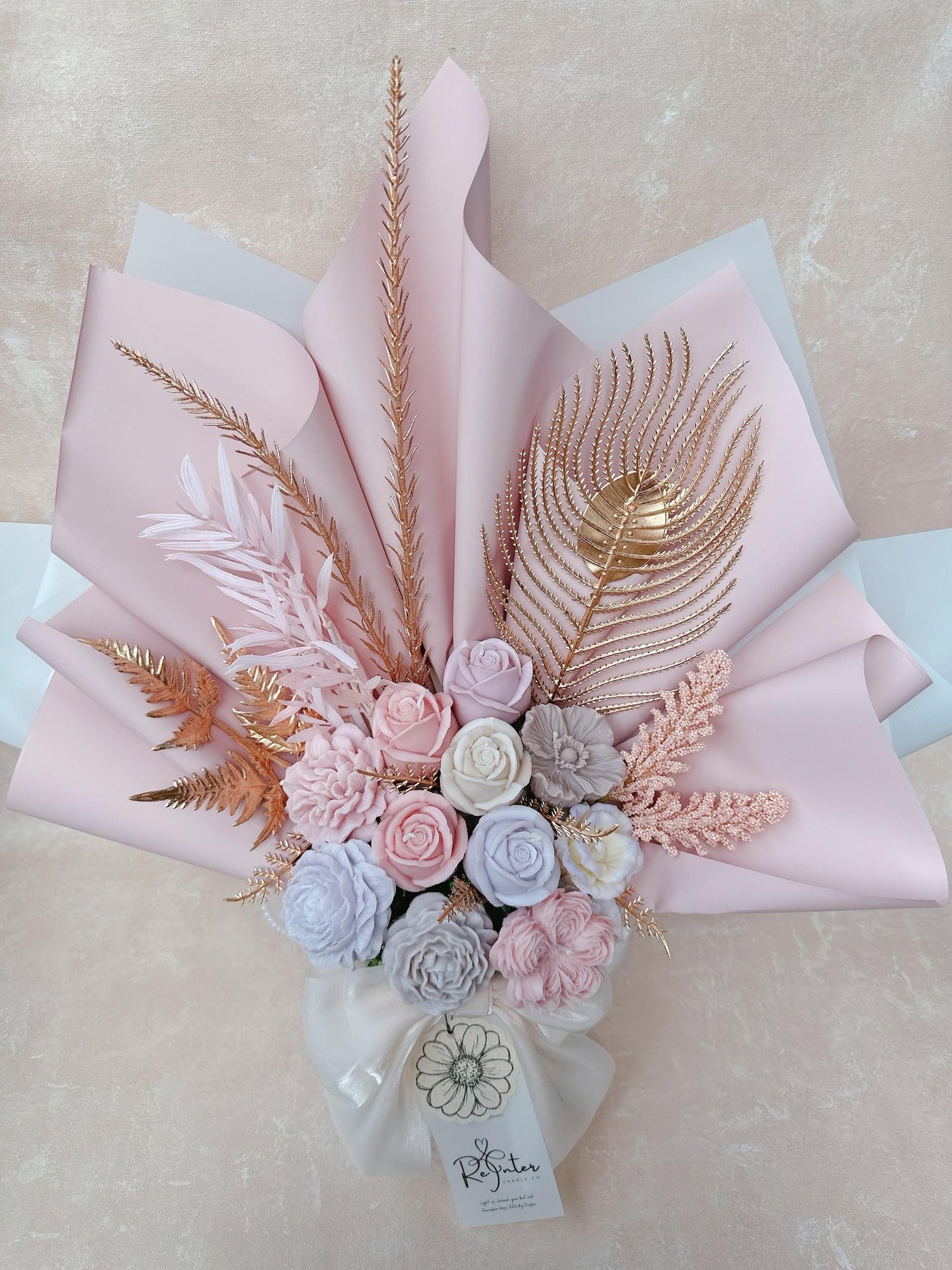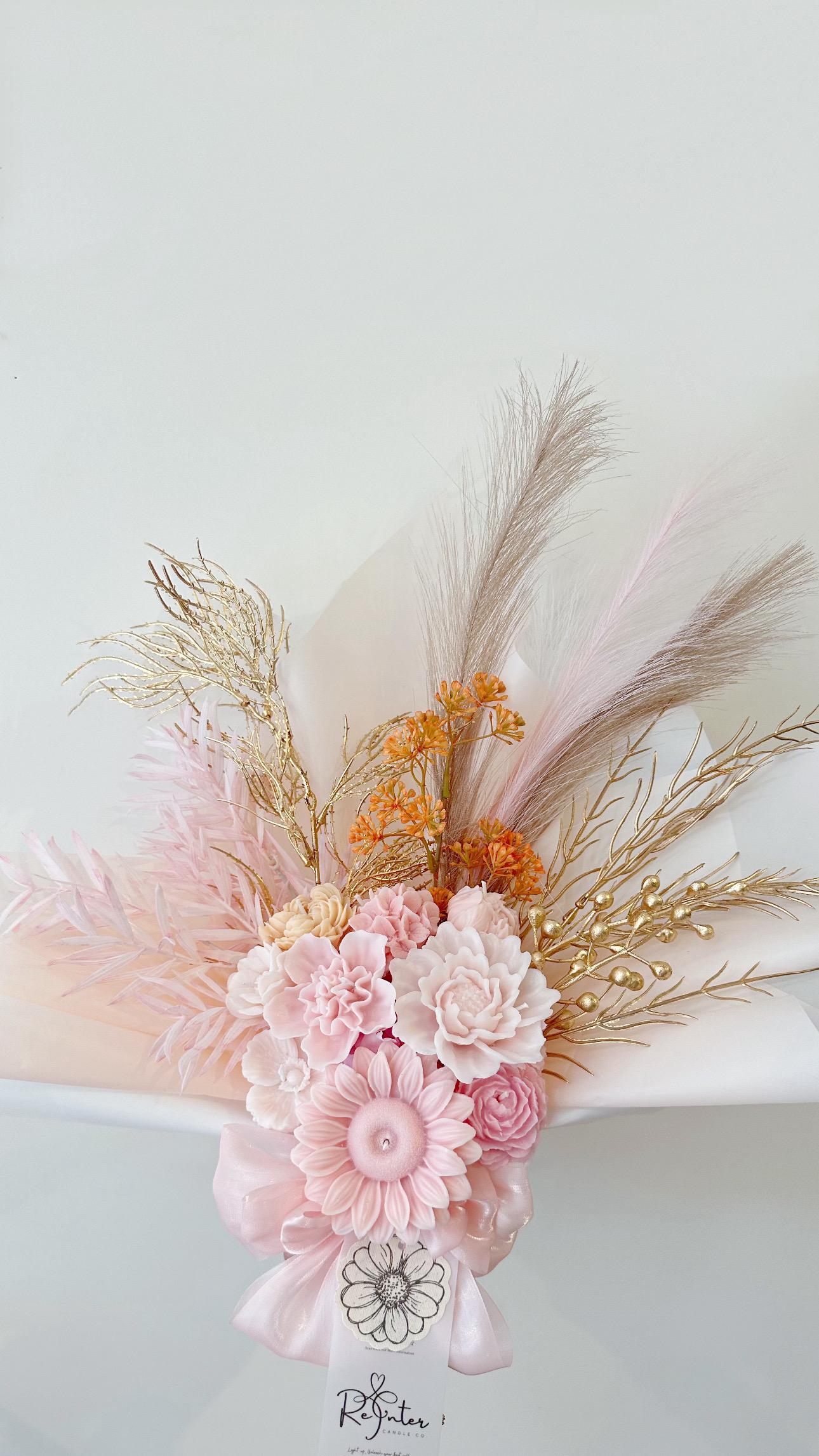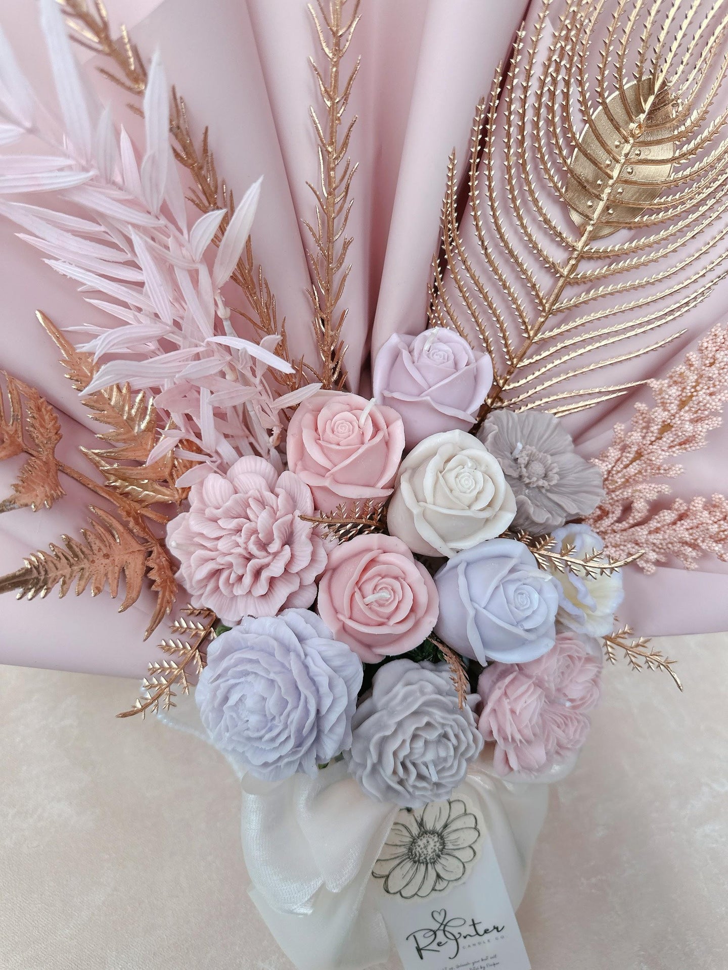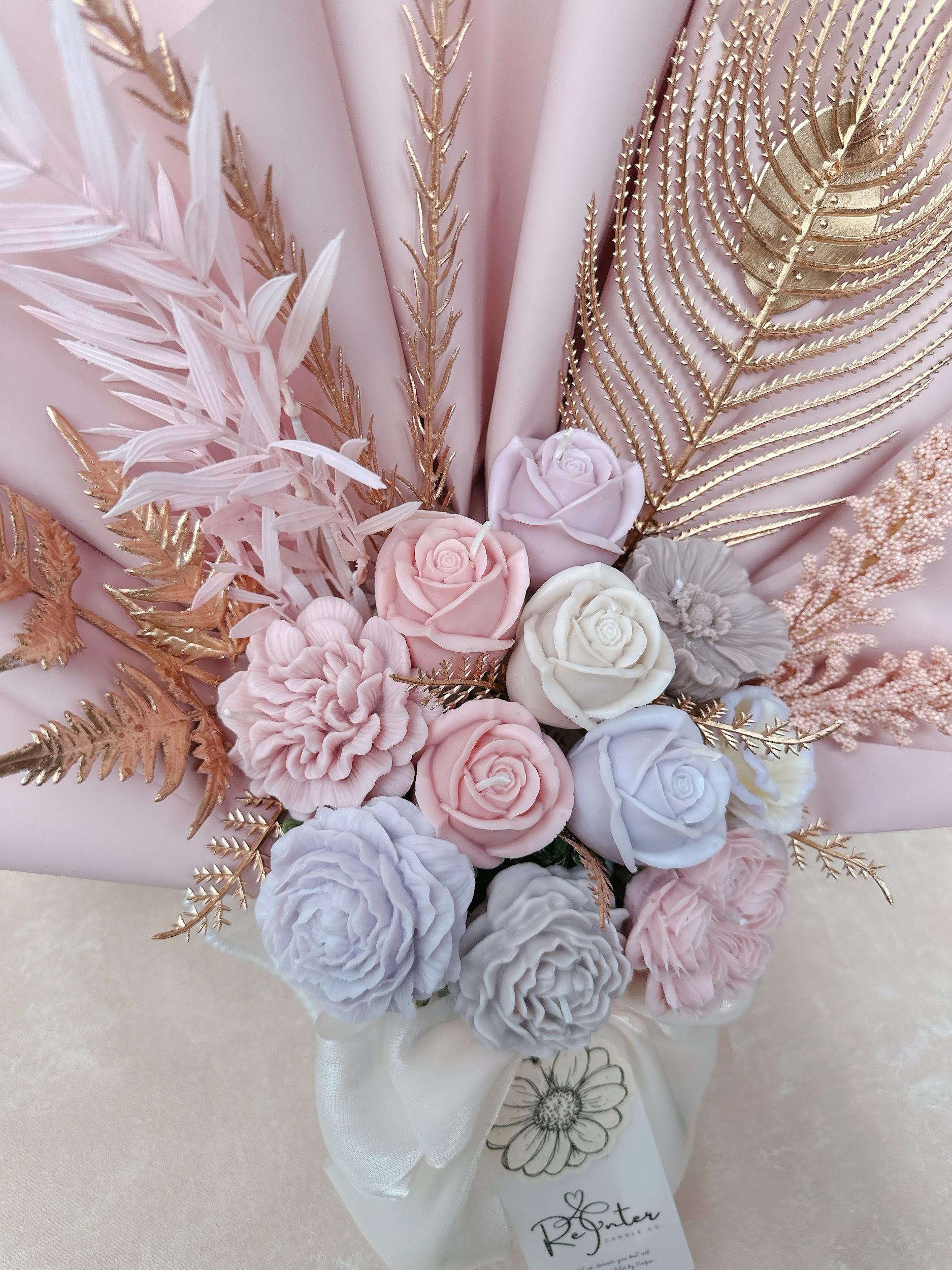 · 清新花香調與粉質香調的結合· 香氣特質與情感:這是一個純真、浪漫且充滿幸福感的組合。蘋果花與鈴蘭都帶有清新、嬌嫩且極度女性化的花香,象徵著純潔與幸福;玫瑰增添了經典的浪漫氣息;白麝香則作為基底,讓所有花香變得柔和、貼膚且朦朧。聞起來就像一場純白色的婚禮,充滿愛與祝福。· 全手工製作 ,純天然大豆蠟· 以粉色系為主 ,純潔浪漫的誓言· 附送心意卡 + 蠟燭碟 + 包裝盒· 可加購 $80展示盒 40cm x 25cm x 45cm